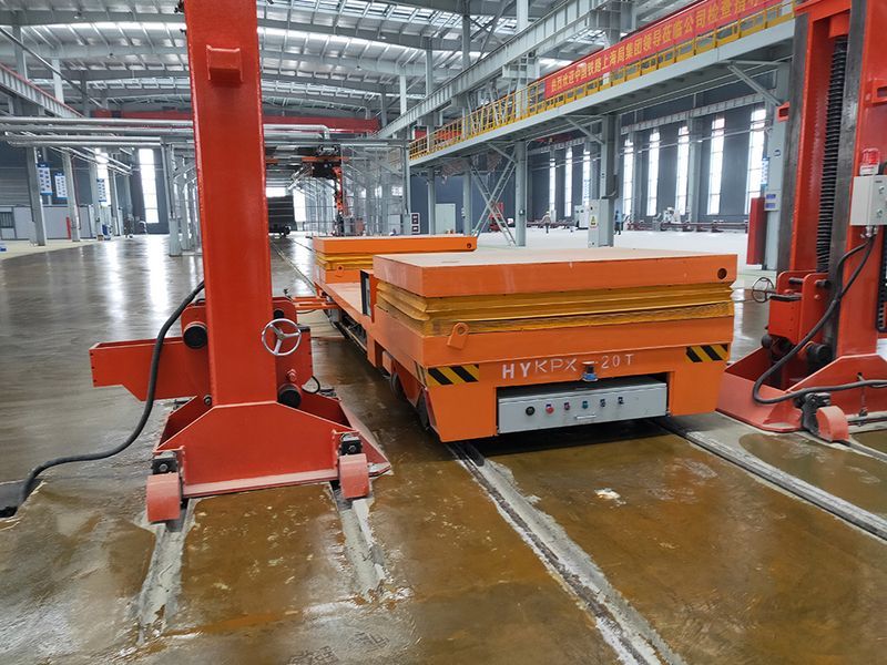 在現(xiàn)在的自動(dòng)化生產(chǎn)車間,常常會(huì)見到很多的交叉軌道,這樣的交叉軌道不只是讓不同軌道上的車輛各自行走,還要求不用的軌道之間互相交換,來實(shí)現(xiàn)不同軌道上的車輛將物件運(yùn)輸?shù)浇徊孳壍赖墓ぷ魑恢蒙?,而要在交叉軌道上行走,就需要轉(zhuǎn)換裝置,這樣就需要特殊的車來實(shí)現(xiàn)這個(gè)功能,我們?nèi)∶麨?strong>縱橫移動(dòng)軌道平車。