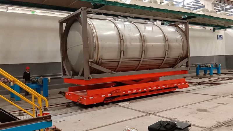 在現(xiàn)在的自動(dòng)化生產(chǎn)車間,常常會(huì)見到很多的交叉軌道,這樣的交叉軌道不只是讓不同軌道上的車輛各自行走,還要求不用的軌道之間互相交換,來實(shí)現(xiàn)不同軌道上的車輛將物件運(yùn)輸?shù)浇徊孳壍赖墓ぷ魑恢蒙?,針?duì)這種工況,百分百公司設(shè)計(jì)了十字交叉平移換軌地平車。